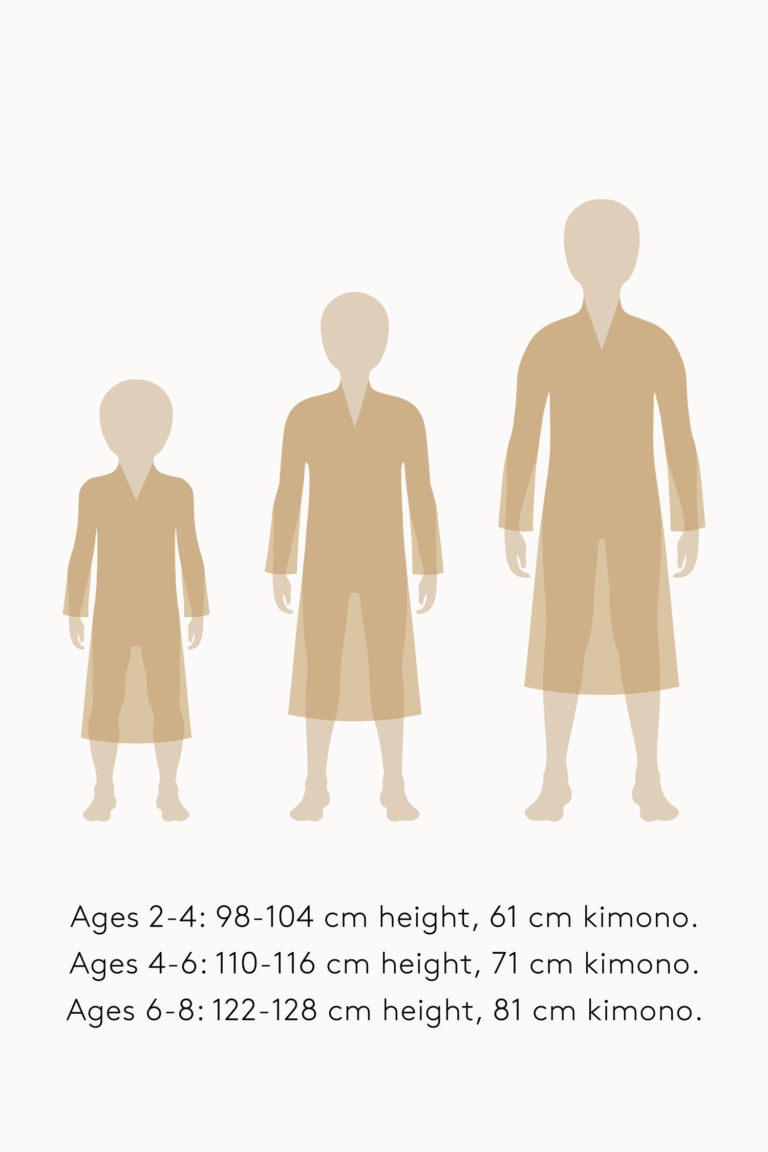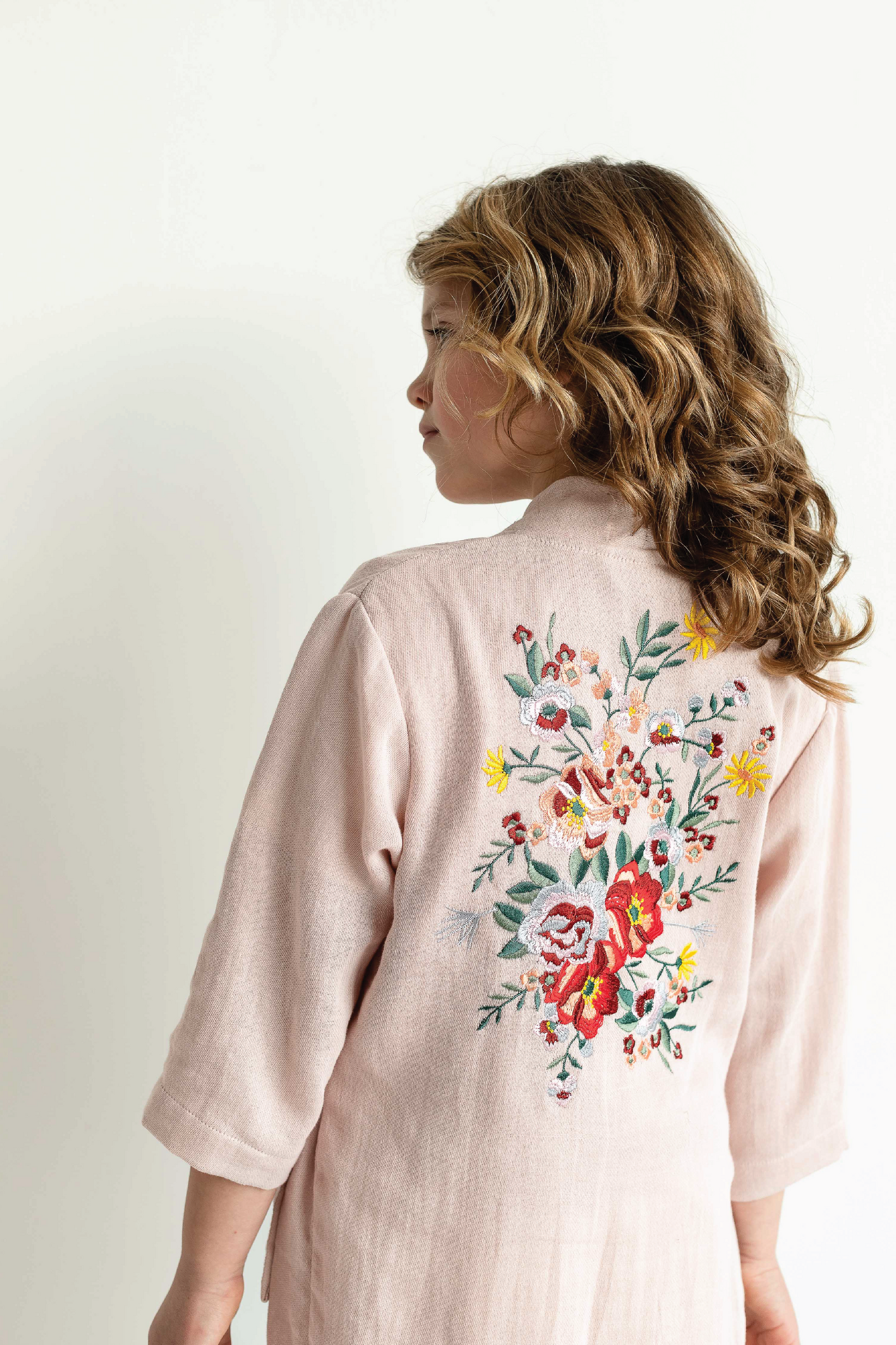 Kids Kimono with long sleeves, pockets and stitched belt. Embroidery at the back.